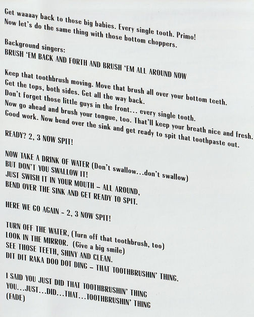 To get things going, take the showeree or toothbrusher through a few "dry runs" with the songs, assisting them with steps and technique (see lyrics below). Once everyone's comfortable with the routine, move on to the real thing, with the music playing while showering or brushing. Dancing and getting into the music are most definitely encouraged. Over time, if you feel comfortable, work toward more self-sufficiency. The goal is maximum independence and soaring self-esteem.